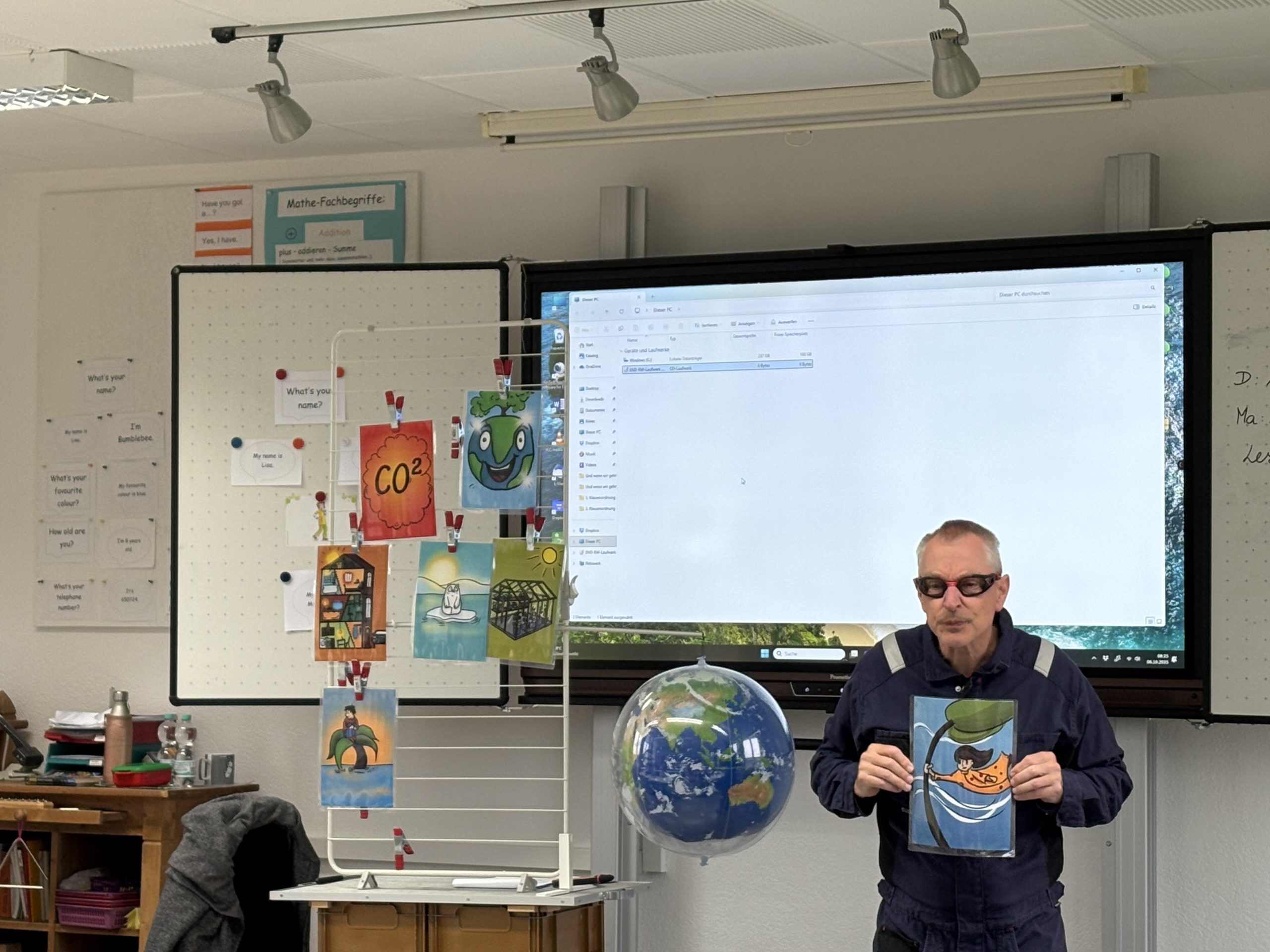 Die aufregende Theaterwoche begann in der dritten Klasse der Grundschule Aidhausen mit dem Besuch eines „Spexianers“ vom Planeten Spex. Er hatte erfahren, dass sich die Erde in einem kritischen Zustand befindet und war sofort zur Stelle, um als Planeten-Experte den Zustand der Erde genauer zu betrachten. Mit tatkräftiger Unterstützung der Schülerinnen und Schüler fand er heraus, warum es auf der Erde immer wärmer wird, wo das CO2 eigentlich herkommt, was der Klimawandel ist und welche Rolle Energie dabei spielt. Gemeinsam wurden Lösungen erarbeitet, wie es gelingen kann, dass es unserem Heimatplaneten Erde wieder gut geht. In einem kleinen Test stellten die Kinder unter Beweis, dass sie nun echte Experten für das Klimasystem der Erde sind. Alle wurden als „Spacemekanix“ ausgezeichnet und gingen anschließend mit Kai Meister auf eine inspirierende Reise in die Welt des Theaters. In Kleingruppen wurden kurze Theaterstücke zu den Themen Feuer, Wasser, Erde und Luft entwickelt und aufgeführt. Die Schülerinnen und Schüler überlegten sich Szenen, wo in Bezug zu den vier Elementen CO2 entsteht und Lösungen, wie der CO2-Ausstoß reduziert werden kann. Die Ideen stellten die Kinder abschließend mit großem Eifer und voller Begeisterung pantomimisch dar.